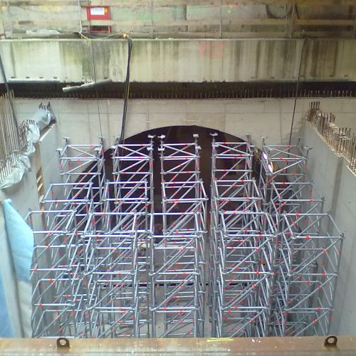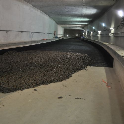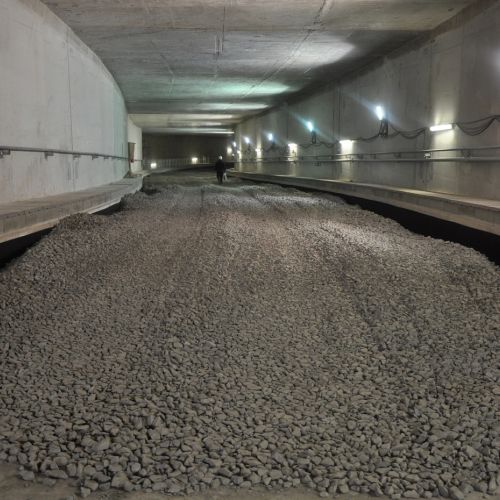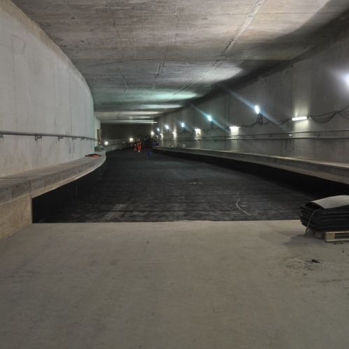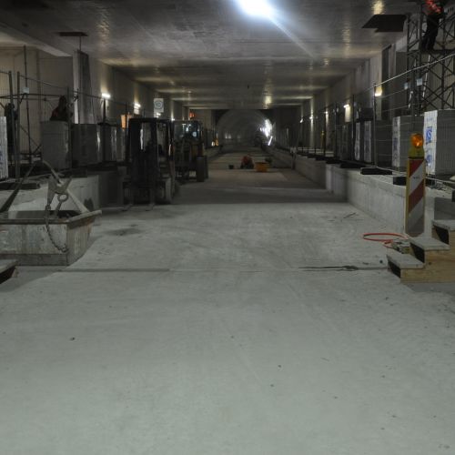 Die Arbeiten begannen mit umfangreichen Erd- und Aushubmaßnahmen, bei denen neue Gleise verlegt und bestehende Schienen angepasst wurden. Die Baustelle war durch die Installation zahlreicher Gerüste und Stützsysteme gesichert, um die Stabilität während des Tunnelbaus zu gewährleisten. Im Tunnelinneren wurden Tragschichten aufgetragen und Gleisbettungen mit Schotter vorbereitet, um eine stabile Fahrbahn zu schaffen.